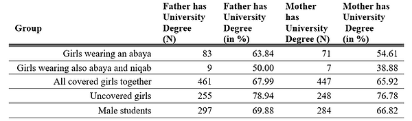70% of the ‘Male Students’’ fathers have university degrees. Within the ‘Covered Girls’ category, the fathers’ education rate goes down for ‘Abaya Wearing Girls’ (64%) and ‘Niqab Wearing Girls’ (53%). The proportions remain almost the same when it comes to the mother’s education. 66% of the ‘Covered Girls’ mothers have a university degree against 77% of the ‘Uncovered Girls’. Again only 57% of ‘Abaya Wearing Girls’’ and only 40% of the ‘Niqab Wearing Girls’’ mothers have a university education.